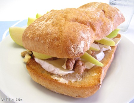 A szendvics-sorozat legújabb tagja, gyakorlatilag egy sajt-tál szendvicsbe pakolva – camembert, mazsola, alma, dió. Illetve nekem dió, Levinek mazsola, mivel én nem szeretem az egyiket, ő pedig allergiás a másikra. Ezen a szinten nem bonyolult “kétfélét főzni”.
