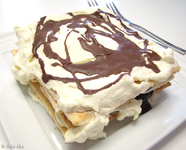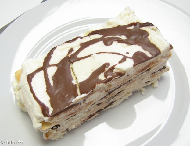 Nyilvánvalóan túl sok amerikai food blog-ot olvasok (és végképp túl sokat nézem az apartment therapyt, és azon belül a thekitchn-t), aminek az eredménye a rajongásunk a ‘mac’n’cheese meg a hamburger meg a chocolate chip cookie meg a cheesecake (stb.) iránt (és én tényleg szeretnék egy szép osztott belsejű lunchbox-ot, bár azt hiszem a meleg ételhez nem ideális, szendvicshez meg rágcsákhoz való). És minduntalan szembejött egy desszert, az “icebox cake”. Tudatlanságban meg nem maradhatok, nekem ezt meg kell csinálnom. Baromi egyszerű (mint az angolszász sütemények általában – igazuk is van, minek nehezítsék meg a saját dolgukat ha nem muszáj), kb. 3-4 hozzávalója van csak, sütni sem kell, és mindenestül 10 perc (plusz 5 perc mosogatás).