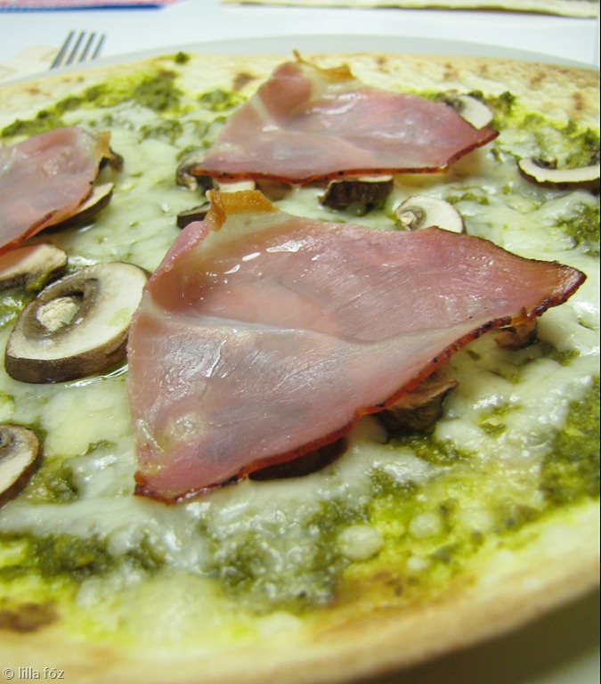 Kicsit több, mint egy hete kiderült, hogy refluxom van, ami elég sokáig tartó gyógyszeres kezelést, és némi* diétát követel. Aminek egy része jó (napi ötszöri étkezés), másik része nem olyan jó (tiltott dolgok). Ez a “pizza” a utóbbi miatt jött létre, mivel a paradicsomról átmenetileg le kell mondanom (vagy legalábbis érdemes, mert rémes gyomorégést okoz), mással kellett megkenni az alapot – az már pár hete kiderült, hogy nagyon jó pizzát lehet sütni tortillalap-alapokon. Mivel kenjem-mivel kenjem… pestoval 🙂 Gondolkodtam fehér (tejföl, besamel, mascarpone stb.) szószokon, de elvetettem, ez volt a legegyszerűbb, épp volt egy bontott üveg a hűtőben.