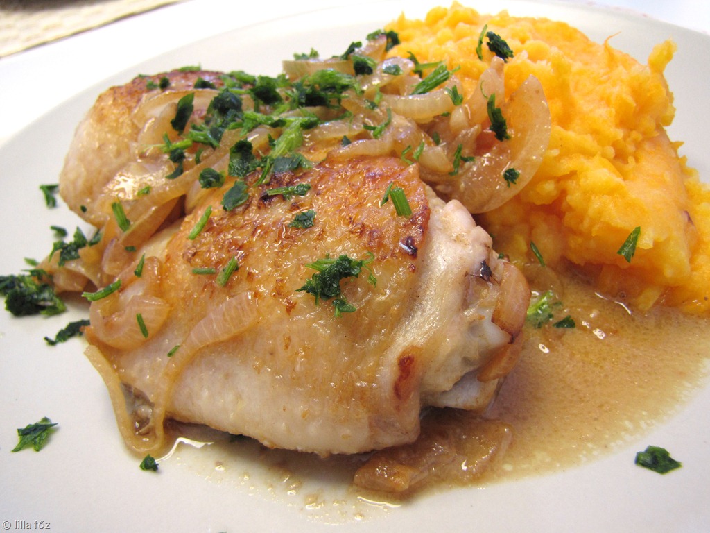 A combokat egy serpenyőben oldalanként pár perc alatt megpirítom (szerintem nem kell alá zsiradék, a felsőcombokból rengeteg kisül). Az elősütött húst egy kis tepsibe teszem, és a sütőt előmelegítem 200 fokra. A serpenyőből kiöntöm a zsírt, beleöntöm az olajat, és a csíkokra vágott hagymát kis lángon karamellizálom (kb. 10 perc). Lehúzom a tűzhelyről, belekeverem a bort és a mustárt, kicsit megsózom, összekeverem, és a hús mellé öntöm. A tepsit szorosan lefedem alufóliával és 30 percre beteszem a sütőbe. Ezután leveszem a fóliát, és még 10 percre visszateszem. Megszórom petrezselyemmel, és sütőtökös krumplipürével tálalom.