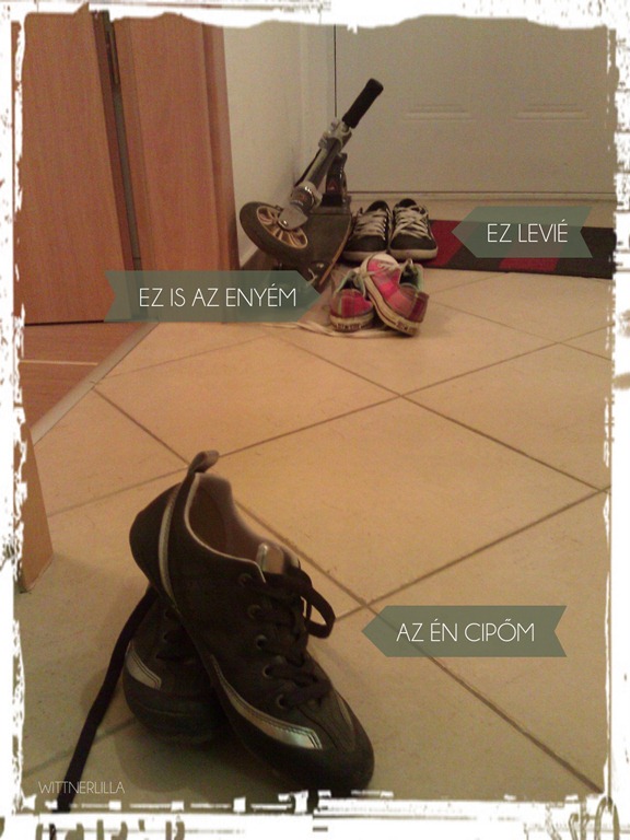 Már korábban is konstatáltam, hogy valami roppant vicces módon tudom levenni a cipőmet, mert mindig egymásra kerül a kettő. Most le is fotóztam este az előszobában. Hát igen, én vagyok kettőnk közül a rendetlenebb.