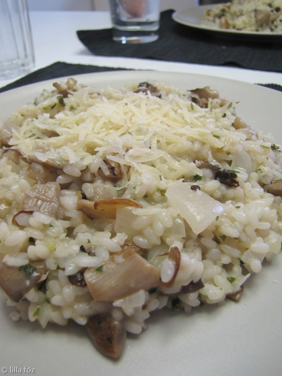 A rizottót megfőzöm a szokásos módon. Közben elkészítem a gombát: a vajat felolvasztom, rádobom a megtisztított, összevágott gombát és a zúzott fokhagymát, és nagy lángon addig sütöm, amíg megpuhul (ekkor ereszt egy csomó levet), majd megpirul kicsit (előbb-utóbb elpárolog az a sok nedvesség, és elkezd pirulni, célszerű teflon-serpenyőt használni hozzá). A majdnem kész rizottóba belekeverem a gombát, készre főzöm, befejezem (vaj,sajt a végén).