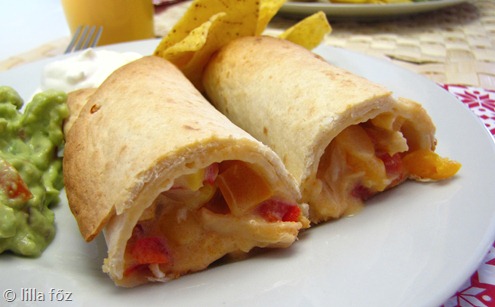 Kevés olajon megsütöm a csirkét, közben apróra vágom a hagymát és a paprikát, a kukoricakonzervet lecsöpögtetem. A maradék olajon pár percig sütöm a hagymát és a paprikát. A csirkét falatnyi darabokra vágom, összekeverem a kukoricával, pár kanál tejföllel és sajtszósszal. Belekeverem a hagymát és a paprikát. Előmelegítem a sütőt 200 fokra, és egy tepsit kibélelek sütőpapírral. A tortillalapokat mikróban átmelegítem, hogy könnyebb legyen őket feltekerni. Minden tortillalapra teszek a töltelékből, szorosan feltekerem, és átemelem a tepsibe. Én az illesztéseknél, biztos-ami-biztos megtűzöm őket 2-2 fogpiszkálóval. Kb. 10 perc alatt ropogósra sütöm, középen elvágom, és tejföllel, guacamoléval és pár szem tortillachipsszel tálalom.
