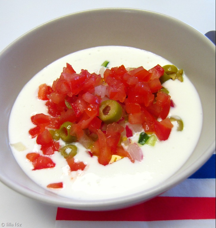 A joghurtot, a fetát, az olajat, a citromlevet és az oregánót összeturmixolom, behűtöm (ha a joghurt és a sajt hideg volt, ez elmaradhat). Tálkákba adagolom, és beleszórom a “levesbetétet”. Tálaláskor lehet még rá locsolni egy kevés olívaolajat.