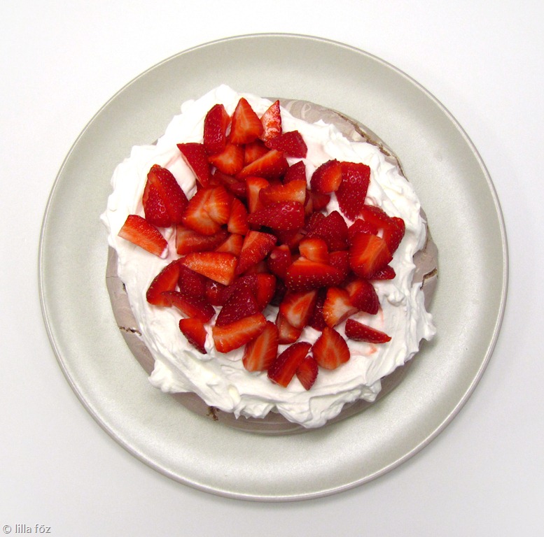 Habcsók recept pl itt. Én most 2 fehérjéből csináltam, és kevertem bele egy kevés kakaóport is. Kör alakban a sütőpapírra kentem, úgy hogy a közepén vékonyabb legyen és kb. 1,5 óra alatt megsütöttem. Tálaláskor felvertem 2 dl tejszínt, rákanalaztam, és bőségesen megpakoltam eperrel. Azonnal fogyasztandó! (légmentesen becsomagolva a habcsók alap eláll pár napig)