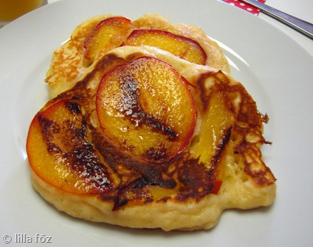 Ez nagyon rövid recept lesz, pontosan úgy készül a tésztája, mint az áfonyásé, csak nem 3 hanem 2 evőkanál cukor kell bele. Értelemszerűen nem kell áfonyát keverni a tésztába, hanem miután belecsurgatom a serpenyőbe a tésztát, belenyomok pár szelet nektarint. Akkor kell megfordítani, amikor már nem folyós a tészta, így nem fognak a gyümölcs-szeletek kipotyogni.