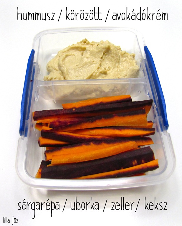 • valamilyen mártogatós, jó sűrű legyen, ez fontos. Azt könnyű enni, és ennek a fajta doboznak van átjárás a két oldala közt. A dobozból nem folyik ki az étel, de egyik rekeszből átmehet a másikba – úgyhogy nem árt ha sűrű. Mi kerüljön a dobozba: hummusz, avokádókrém, zöldfűszeres túrókrém, tojáskrém (ennek erős a szaga!), padlizsánkrém…