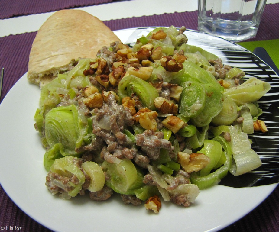 A pórét alaposan megmosom*, felkarikázom. A hagymát felaprítom. Az olajat felhevítem egy nagy serpenyőben és megpirítom rajta a darált húst (fehéredjen ki az egész, és ha engedett levet, azt elfőzöm alóla). Hozzáadom a pórét, a hagymát, belenyomom a fokhagymát és addig pirítom, amíg a póré kicsit összeesik. Megszórom a liszttel, felöntöm a tejszínnel és 1,5 dl vízzel, 8-10 percig főzöm. Sóval, borssal, szerecsendióval ízesítem, rászórom az összevágott diót, és pitával vagy barna kenyérrel tálalom.