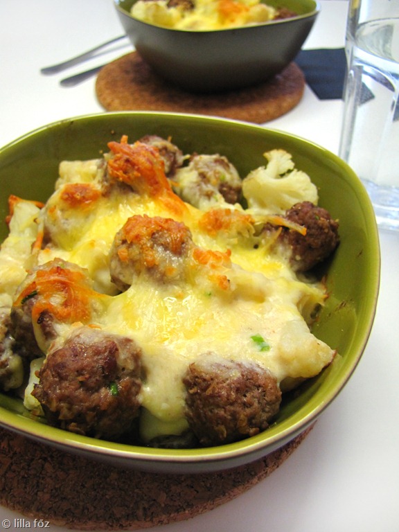 Előveszek egy nagyobb, vagy két kisebb tűzálló tálat. Az aljára rakom a leszűrt karfiolt, ráteszem – és kicsit elkeverem – a húsgolyókat. Leöntöm a besamellel, megszórom egy kis reszelt sajttal, és addig sütöm, amíg a sajt megpirul.