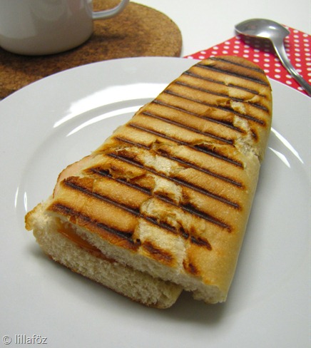 A bagettet kb. fele annyi ideig sütöm, mint a zacskón megadott, majd félreteszem hűlni, kettévágom, megvajazom, telepakolom mindenfélével, és pár perc alatt készre sütöm a csíkos betéttel a gofrisütőben. Azért jó nem készre sütni, mert így nem olyan kemény még a héja, és könnyebben-szebben összenyomható.