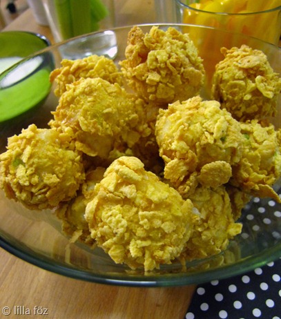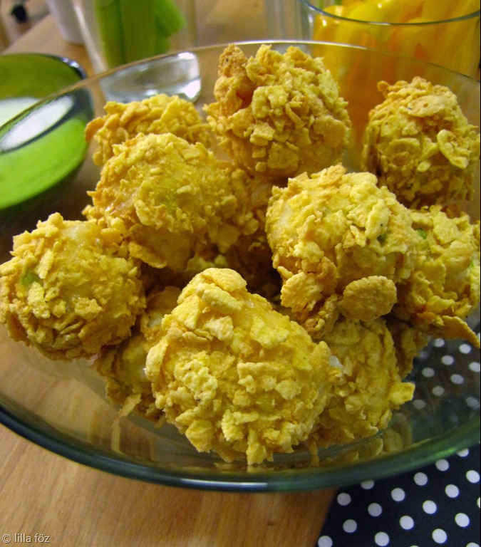 A csirke-falatok hozzávalóit egy tálba teszem, és összekeverem. Kézzel simára “gyúrom”, majd kis golyókat formázok belőle, és tálcára teszem. A corn flakest kézzel összetöröm, és a golyókat a szokásos módon bepanírozom – liszt – tojás – corn flakes. A golyókat sütőpapírral bélelt tepsibe teszem, és előmelegített sütőben, 180 fokon kb. 20-25 perc alatt megsütöm. Melegen a kéksajtos mártogatóssal és a zöldségekkel tálalom.