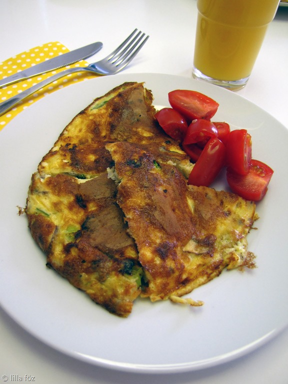 Egy serpenyőben felhevítem az olaj felét, beleöntöm a tojásos masszát és közepes lángon pár percig sütöm – amíg az egész megszilárdul. Egy tányér segítségével megfordítom (közben ha szükséges a serpenyőbe öntöm a maradék olajat), és pár perc alatt készre sütöm. Cikkekre vágva tálalom.