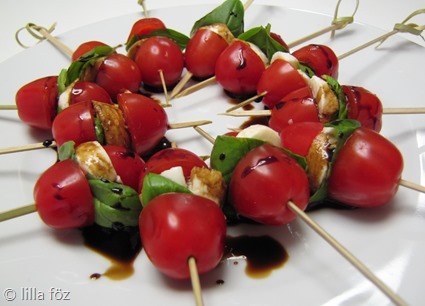 Minden nyársra egy paradicsom kerül, közé pedig 1-1 bazsalikomlevél és egy darab sajt. A nyársakat tálra rakom, és meglocsolom a balzsamecetes öntettel.