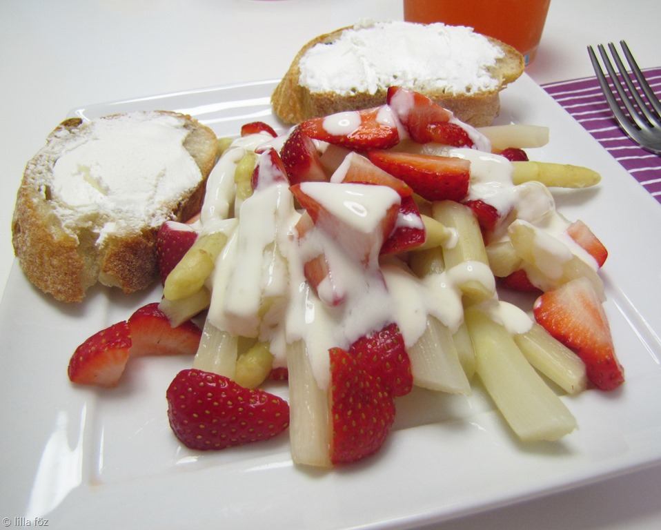 A spárgát megtisztítom, 2-3 cm-es darabokra vágom, 12 perc alatt megfőzöm, leszűröm. Az epret megmosom, felvágom, és a spárgával együtt tányérokra rakom. Az öntet: 2-3 rész tejföl, 1 rész tejszín, 1 rész narancslé. Összekeverem, sózom, borsozom, és a salátára csurgatom. Aki szereti, megszórhatja zöldborssal. Én kecskesajtos gyökérkenyérrel tálaltam.