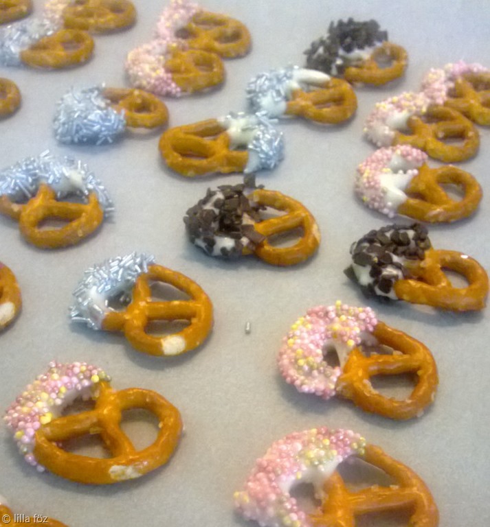Csokoládét olvasztok, belemártogatom a kis sós pereceket. Dekorcukorba mártom, és sütőpapírral bélelt tepsibe/tálcára rakom, amíg a csokoládé meg nem dermed.