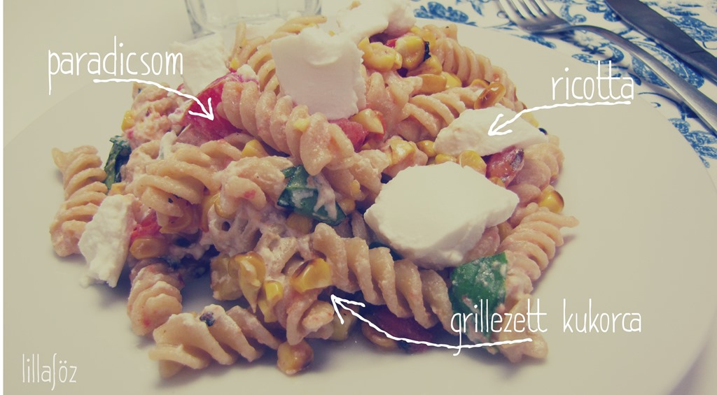 A kukoricát megtisztítom, kevés vajjal “megmasszírozom”, a paradicsomokat félbevágom, és kivágom a zöld közepüket. A zöldségeket pár perc alatt megsütöm (grillserpenyőben is lehet). A tésztát megfőzöm a csomagolás szerint. A langyosra hűlt kukoricáról éles késsel levágom a szemeket, a paradicsomot nagyobb darabokra vágom. A tésztát összekeverem egy kevés olívaolajjal, a kukoricával és a paradicsommal és jó sok friss bazsalikommal. Sózom, borsozom és belekeverem a ricotta kétharmadát. Tálalás előtt a tetejére kanalazom a maradék ricottát.