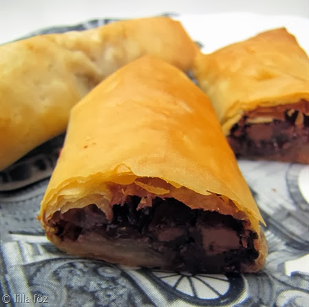 A réteslapokat középen kettévágom. A csíkokat megkenem olajjal. A rövidebbik végükbe pakolok egy kis körtét és csokoládét, a hosszú oldalakat kicsit behajtom, és feltekerem. Sütőpapírral bélelt tepsibe rakom, megkenem olajjal, és előmelegített sütőben, kb. 200 fokon 12-14 perc alatt megsütöm. Aznap, langyosan-hidegen a legjobb.