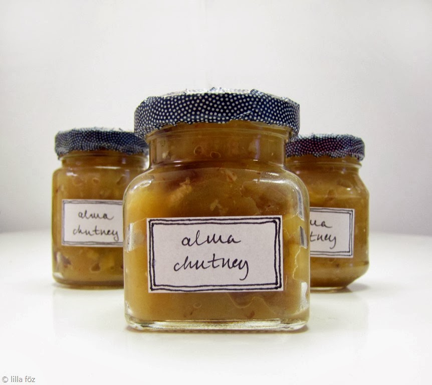 Az olajat felhevítem és a hagymát addig sütöm, amíg elkezd karamellizálódni. Hozzáadom a zúzott fokhagymát és a gyömbért, 1-2 percig sütöm. Belekeverem a cukrot, az ecetet, az almát és a sót. Pár perc főzés után, amikor az alma elkezd megpuhulni, burgonyanyomóval kicsit megnyomkodom (így nem kell annyi ideig főzni, és nem marad túl darabos). Hozzáadom a mazsolát, majd néhány perc főzés után a zselésítőt, üvegekbe töltöm, pár percre fejre állítom.