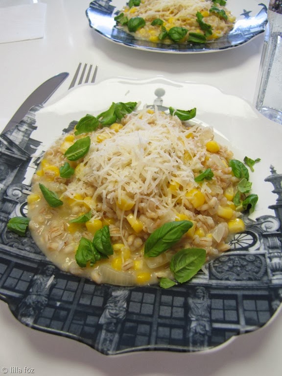 Végeláthatatlan rizottó recept van már a blogon, úgyhogy ezt most nem részletezem. Ugyanúgy készül, mint a hagyományos, csak a főzési ideje 40-50 perc. A kukoricát csak az utolsó 4-5 percben adom hozzá, amikor már majdnem teljesen puha az árpa.