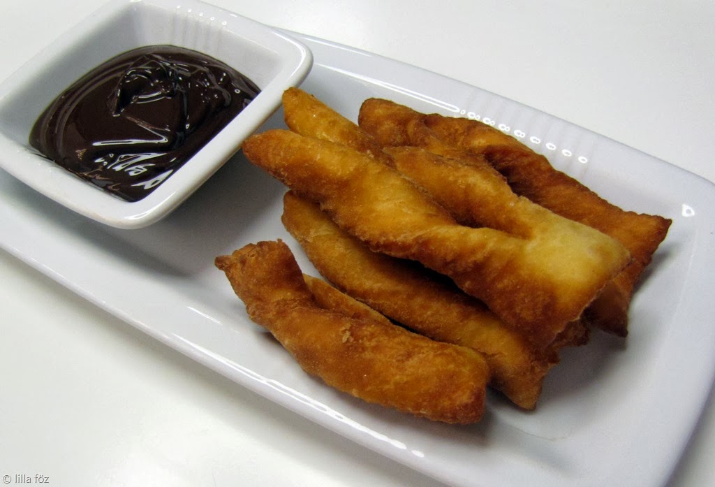 Lisztezett deszkán vékonyra nyújtom, és kb. 3×10 cm-es darabokra vágom. Mindegyiken ejtek egy hosszanti vágást, a tésztadarabok egyik végét átfűzöm a lyukon, és kicsit meghúzom. Forró olajban pár perc alatt megsütöm. Még forrón megporcukrozom, és lekvárral vagy olvasztott csokoládéval tálalom.