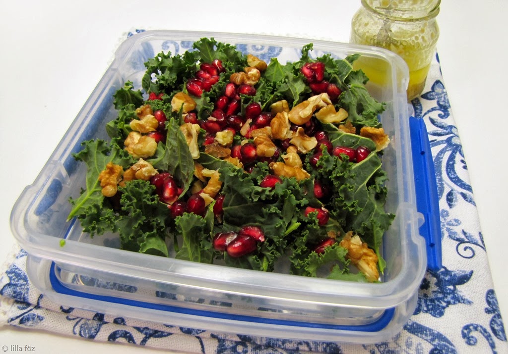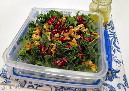 A fodros kelt megmosom, megszárítom, a leveleket letépkedem a szárról és egy tálba teszem. Összekeverem a hagymával, a gránátalmával, az összevágott dióval és összeforgatom a vinaigrette-tel.