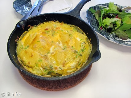 A serpenyőben (lehetőleg öntöttvas legyen, és mindenképp bírja a sütőbe-rakást), felhevítek egy kis olajat, pár percig sütöm benne a hagymát és a fokhagymát, majd hozzáadom a krumplit. Időnként átkeverve addig sütöm, amíg nagyjából megpuhul. Közben a tojásokat villával felverem, megsózom, összekeverem némi friss finomra vágott zöldfűszerrel. A tojást a krumplira öntöm, és előmelegített, 200 fokos sütőben addig sütöm, amíg a tojás megszilárdul (5-7 perc). Cikkekre vágva, salátával tálalom.