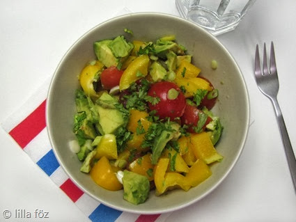 A könyvben visszakanalazzák a salátát az avokádó héjába, nekem elég kicsi avokádóm volt, nem fért volna el benne, és egyszer kellene a héja, nyilván akkor nem sikerül szépen szétvágni…