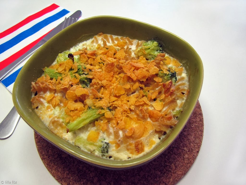 Egy fazékban vizet forralok, 2 percig főzöm a brokkolit, majd szűrőkanállal kiszedem, és hagyom lecsöpögni. A vízbe dobom a tésztát és a csomagoláson látható főzési időnél 2-3 perccel kevesebb ideig főzöm. Ezt is leszűröm. Kiöntöm a vizet, és szárazra törlöm a fazekat. Felhevítem az olajat, pár percig sütöm a hagymát, majd hozzáadom a lisztet, és pár perc alatt világosbarnára pirítom. Hozzáadom a tejet, simára keverem, és felforralom. Néhány percig főzöm, hogy kicsit besűrűsödjön. Lehúzom a tűzhelyről, belekeverem a ricottát és a parmezánt, sózom, borsozom. Beleforgatom a brokkolit és a tésztát. Sütőtálba kanalazom, rászórom a corn flakest, és forró sütőben (200 fok) 20-25 percig sütöm. Tálalás előtt pár percig hűlni hagyom.