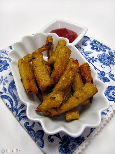 Igazából “baked polenta “fries””, azaz polenta/puliszka csíkokra vágva, kevés olajjal meglocsolva és sütőben ropogósra sütve. Ugyanúgy lehet ketchupbe tunkolva enni, mint a hasábburgonyát. A képen a puliszka azért barnás kicsit, mert szárított gombás polenta volt itthon. “Csak”.