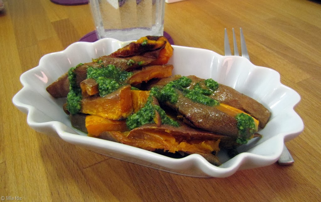 Fogok pár édesburgonyát, alaposan megsikálom, és vastag cikkekre vágom. Tepsibe teszem, összeforgatom 1-2 evőkanál olívaolajjal, kicsit megsózom, és forró, 220 fokos sütőben kb. 25 perc alatt megsütöm. Tálaláskor házi petrezselyem-dió pestot kanalazok rá.