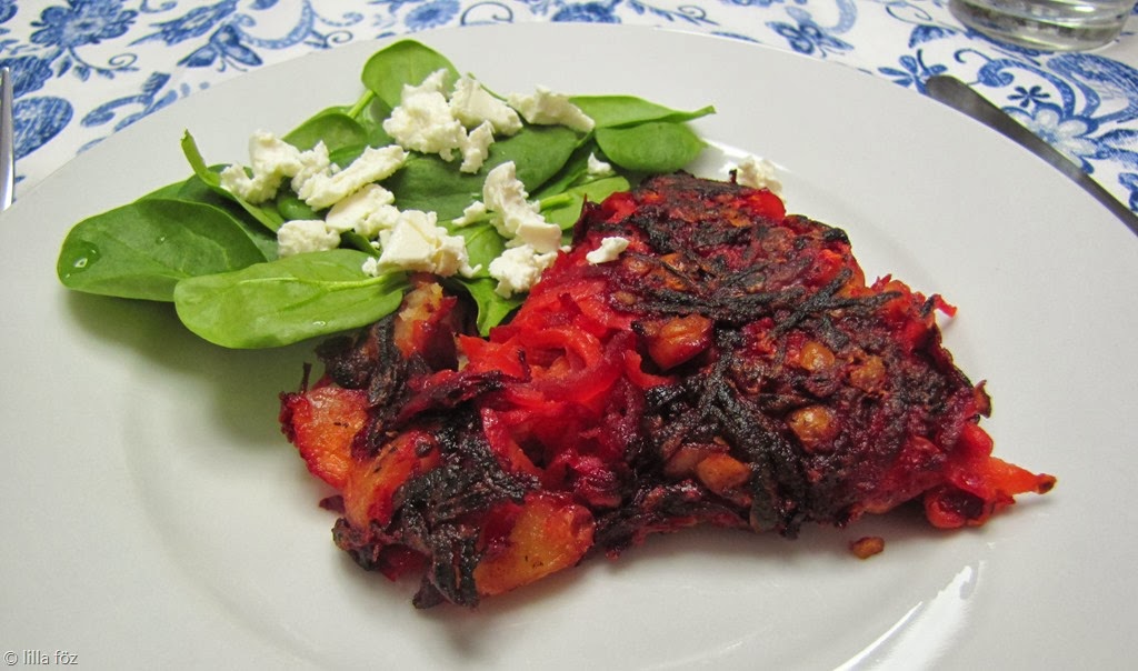 A burgonyát meghámozom, kis kockákra vágom, és megfőzöm (nem kell nagyon puhára, 5-6 perc főzés elég kell legyen). A céklát és a répát meghámozom, és a kisebb lyukú reszelőn lereszelem. A csicseriborsót kissé szétnyomkodom (összevágom). A leszűrt burgonyát összekeverem a répával, a céklával, a csicseriborsóval és a liszttel. Sóval, borssal ízesítem. Egy nagyobb serpenyőt közepes lángon felhevítek. Beleöntöm az olaj felét, majd belesimítom, és lenyomkodom a zöldséges masszát. Kb. 10 percig sütöm, ha ennyi idő alatt nem kezd el pirulni az alja, kicsit magasabb hőmérsékletre állítom a főzőlapot. Egy tányér segítségével megfordítom, ha szükséges, a maradék olajat közben az üres serpenyőbe öntöm. Újabb 10-12 perc alatt a másik oldalát is ropogósra sütöm.