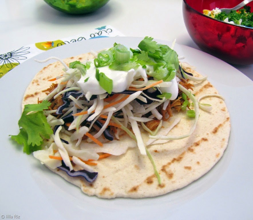 - puha taco-hoz való búzatortilla (átmelegítettem a csomagolás szerint)