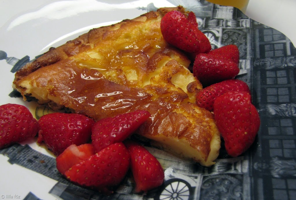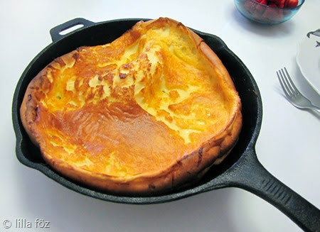 A tészta összes hozzávalóját összeturmixolom. A tésztát a meleg (olvasztott vajat tartalmazó) serpenyőbe öntöm, és beteszem a sütőbe. Kb. 20 perc alatt sül meg. akkor jó, ha a széleken szépen felpuffadt, és kicsit megpirult.