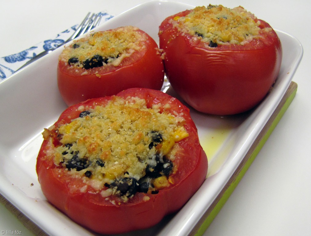 Az egyetlen nehézség, megszerezni a megfelelő méretű paradicsomokat (és esetleg szemmértékkel eltalálni a szükséges töltelék mennyiségét).Nem mértem semmit sem, úgyhogy aki reprodukálni szeretné, az kóstolgasson, és próbálja megsaccolni a paradicsomok mérete alapján, hogy mennyi bab és kukorica kell.