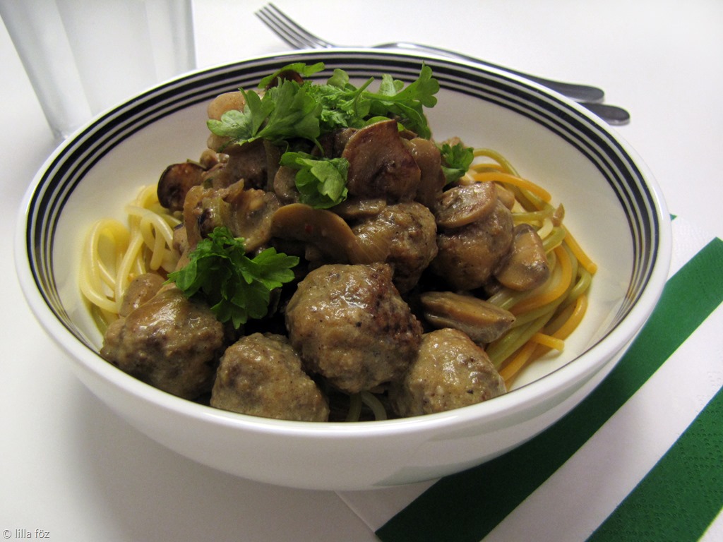 Egy nagy serpenyőben kevés olajat hevítek, és nagy lángon körben megsütöm a húst. Nem baj, ha nincsenek mindenhol megsülve, és nem pirultak meg mindenhol. A húsgolyókat kiszedem egy tányérra, ha túl sok zsiradék van a serpenyőben, kiöntök belőle, és magas lángon megsütöm a hagymát és a gombát. Addig kell sütni, hogy a gomba által engedett lé elpárologjon, és elkezdjen pirulni. Visszarakom a húsgolyókat, hozzáadom a bort (és ha szükséges, egy kis vizet), és fedő alatt készre főzöm – itt érdemes elkezdeni a tésztafőzést. Végül hozzáadom a tejszínt, ha szükséges, sózom, borsozom, összeforralom, és tésztával, petrezselyemmel megszórva tálalom. (A főzés végén ha nincs elég leve, érdemes víz helyett a tészta főzővizéből adni hozzá).