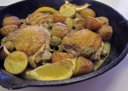 Ez első receptet a serpenyős fejezetből választottam, csirkecomb, krumpli, citrom, olajbogyó. Kb. mindent el is mondtam ezzel.