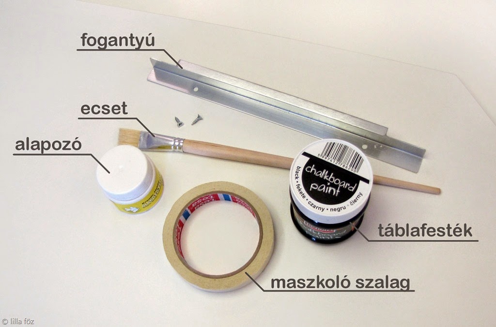 Ami kellett: nyilván az alap, amit festünk. Mivel a bútorlap nem ideális festési alapanyag, a táblafesték előtt – biztos-ami-biztos–, két rétegben lealapoztam (sima hobbi boltos alapozófestékkel). Majd száradás után jött két réteg táblafesték.