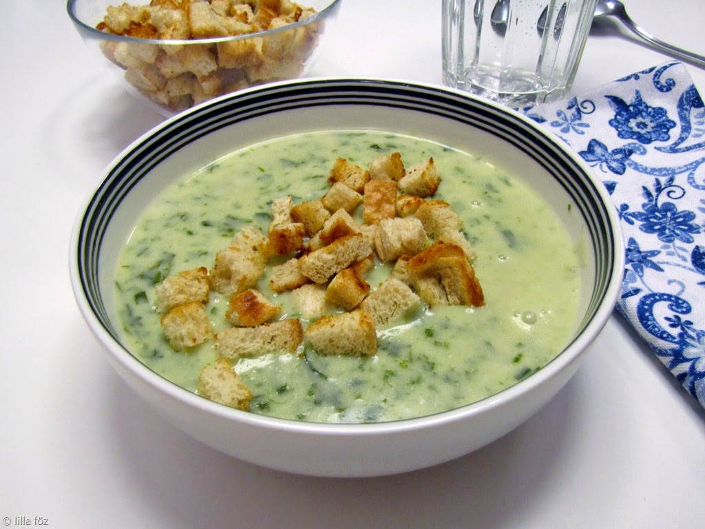 Az újságban még extrább ez a leves, mert valami sonkás-réteslapos dolog készül mellé. De sonkát nem eszem, a réteslaptól hisztérikus leszek (plusz elég nehéz 1 darabot venni belőle), úgyhogy marad a jó öreg kenyérkocka.