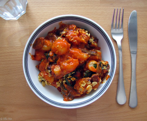 Sózom, borsozom, belekeverem a kakukkfüvet, és pár percig főzöm. Belekeverem a sült gombát, a bébispenótot és a gnocchit. A sütőt előmelegítem 200 fokra, és előveszek egy kb. 20×20-as sütőtálat. A paprikaszószos gnocchit a sütőtálba kanalazom, a tetejére corn flakes-t szórok, és addig sütöm, amíg a szósz bugyogni kezd (kb. 15 perc).