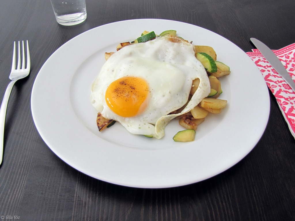 Az eredeti neve potato and zucchini hash, nem tudom, hogy lehetne ezt legjobban lefordítani, jobb híján reggeli tojás és burgonya (krumpli, na) egytál lett belőle.