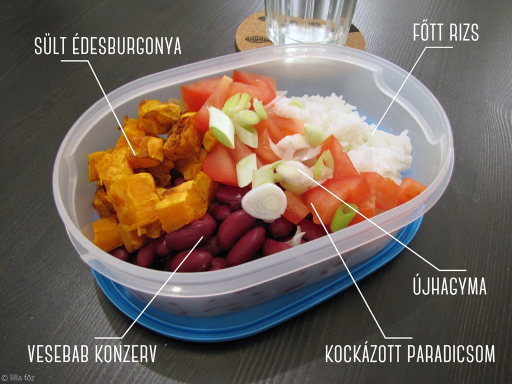 Egy kép többet ér ezer szónál… És ezen a képen rajta van gyakorlatilag az egész recept. Mostanában ez a jolly joker étel, ha se ötletünk, se kedvünk nincs a hétköznap esti főzőcskézéshez. Maradék rizs is jó hozzá, az édesburgonya is eláll sütve pár napot a hűtőben. Úgyhogy ha véletlenül főtt rizs és sült édesburgonya is van kéznél, tényleg csak össze kell lapátolni a hozzávalókat 1-1 dobozba.