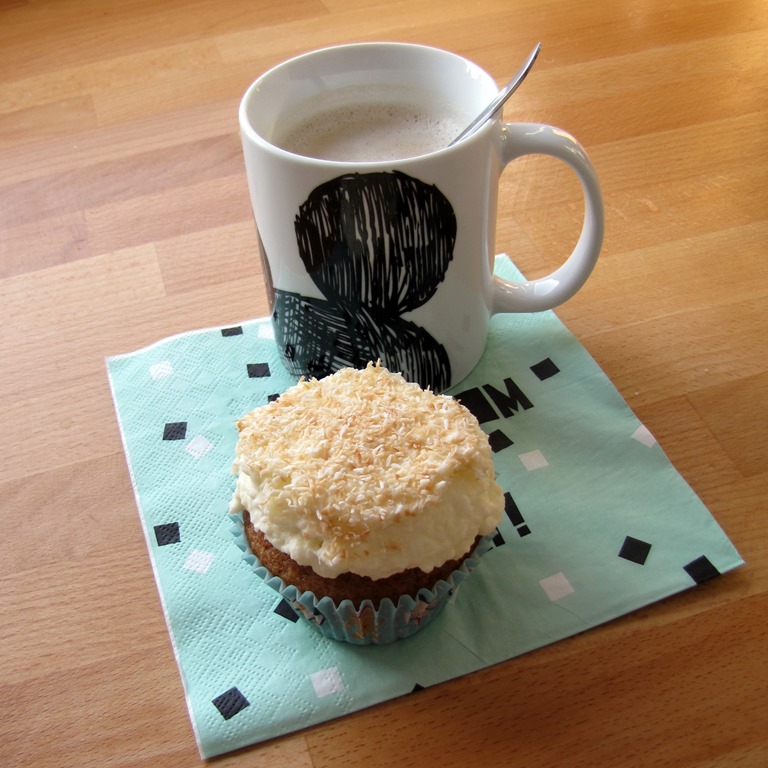 Ha a muffinok kihűltek, rájuk kenem a krémet. Elsimítom a tetejüket, és finoman belenyomom a pirított kókuszba. Tálalásig hűtőbe teszem.