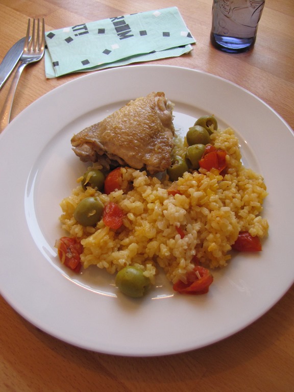 Hozzáadom a rizst, az alaplevet az olajbogyót, és alaposan elkeverem. Bőrös oldalukkal felfelé beleteszem a csirkecombokat, lefedem és 25-30 percre beteszem a sütőbe. Akkor jó, ha a rizs beszívta a folyadékot és a csirke átsült. Tálalás előtt lefedve 5-10 percig pihenni hagyom.
