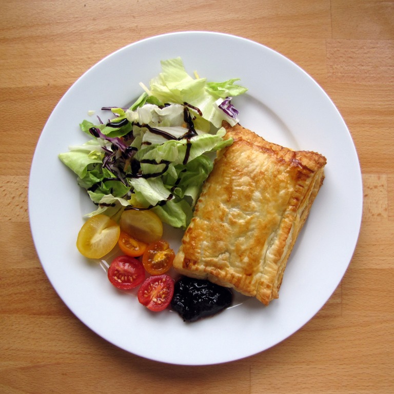 Zöldséges-gesztenyés töltelékkel töltött, leveles tésztás mini-piték. Salátával (vagy párolt zöldséggel) és áfonyalekvárral tálalva.