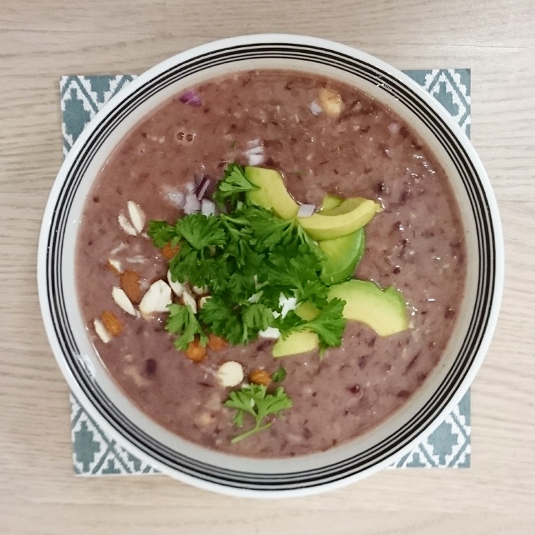 Egy fazékban felhevítem az olívaolajat. A lilahagymából kb. egy evőkanálnyit félreteszek a tálaláshoz, és a többit az olajhoz adom. Pár perc alatt üvegesre sütöm, majd hozzáadom a zúzott fokhagymát és a római köményt. Egy percig együtt sütöm, majd felöntöm a levessel, és beleszórom a babot.