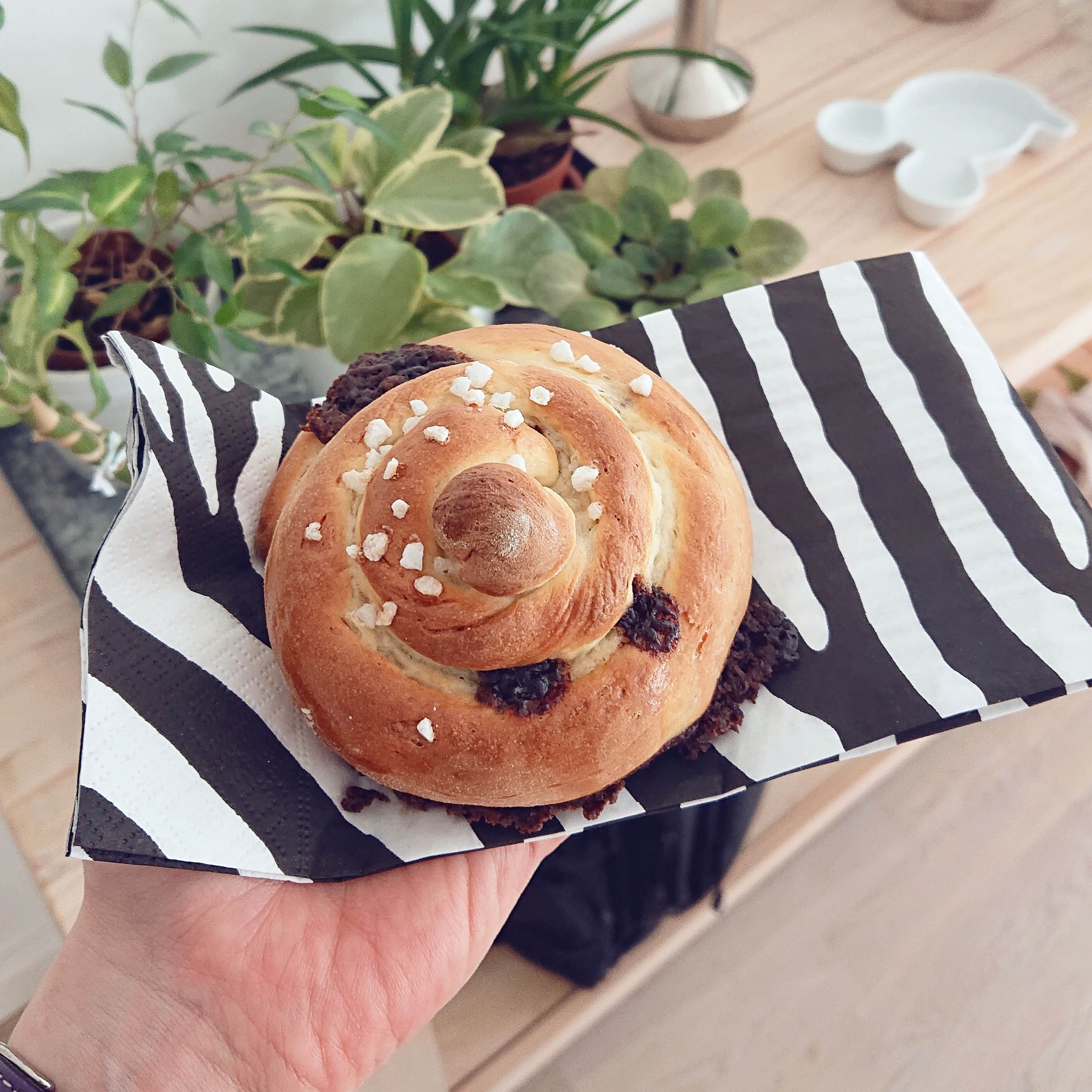 Ez gyakorlatilag a briós és a mogyorókrémes csiga szerelemgyereke. Briós alakú, de töltött, úgyhogy könnyebb egyet magunkkal vinni. És noha egy kicsit kifolyt a töltelék, azért nem annyira maszatos mint egy kakaós vagy mogyorókrémes csiga. Szóval könnyebb magunkkal vinni.