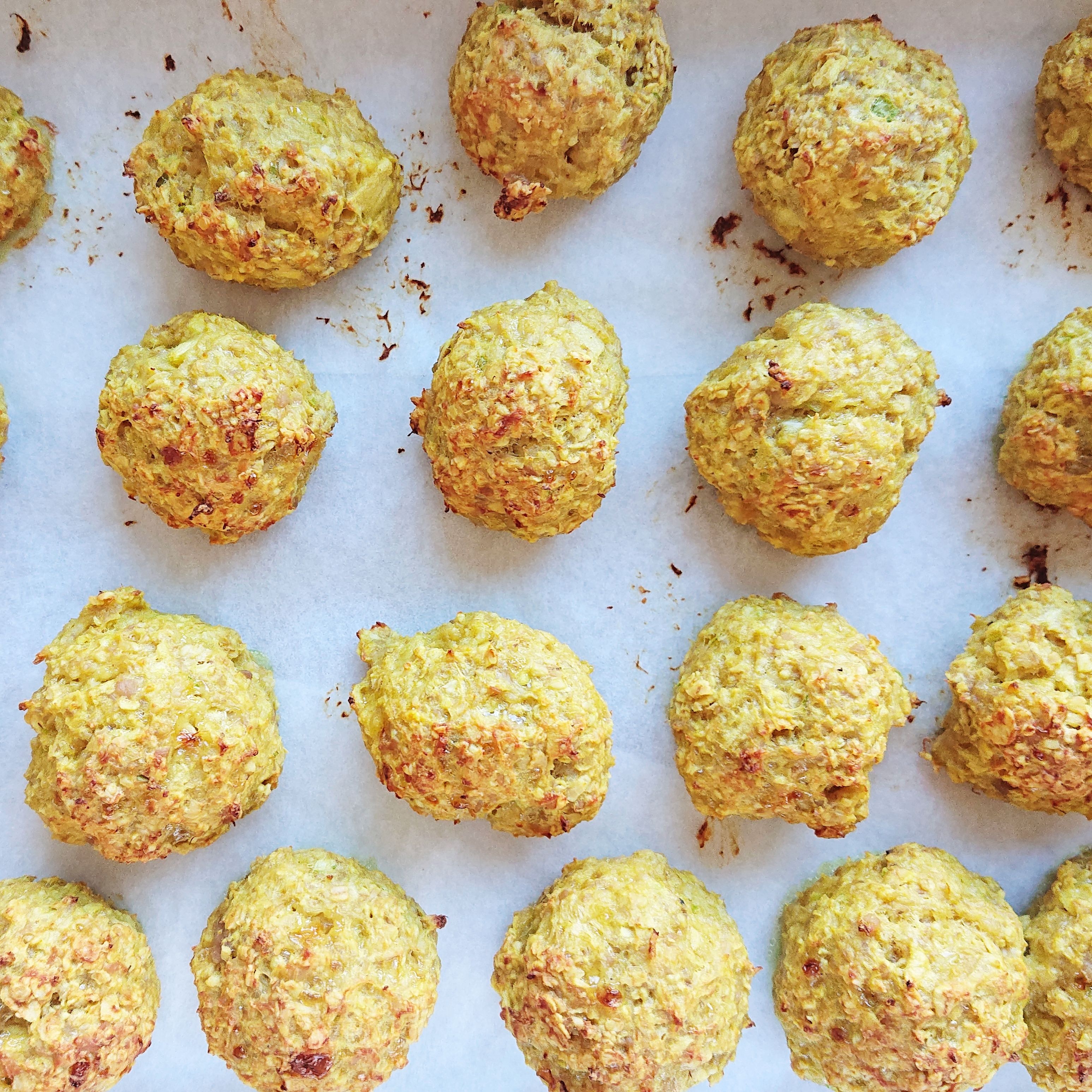 Az eredeti recept innen van, kicsit változtattam rajta az itthon fellelhető hozzávalók függvényében. Mivel az rögtön nyilvánvaló volt, hogy két nap alatt nem fog elfogyni az összes (jelenleg egy nap maximum 3 valamilyen falatka fogy el), rögtön befagyasztottam a nagyobbik felét. Kiválóan fagyasztható, pár óra alatt kiolvad, aztán egy pár másodpercre bedobom a mikróba és már lehet is falatozgatni.