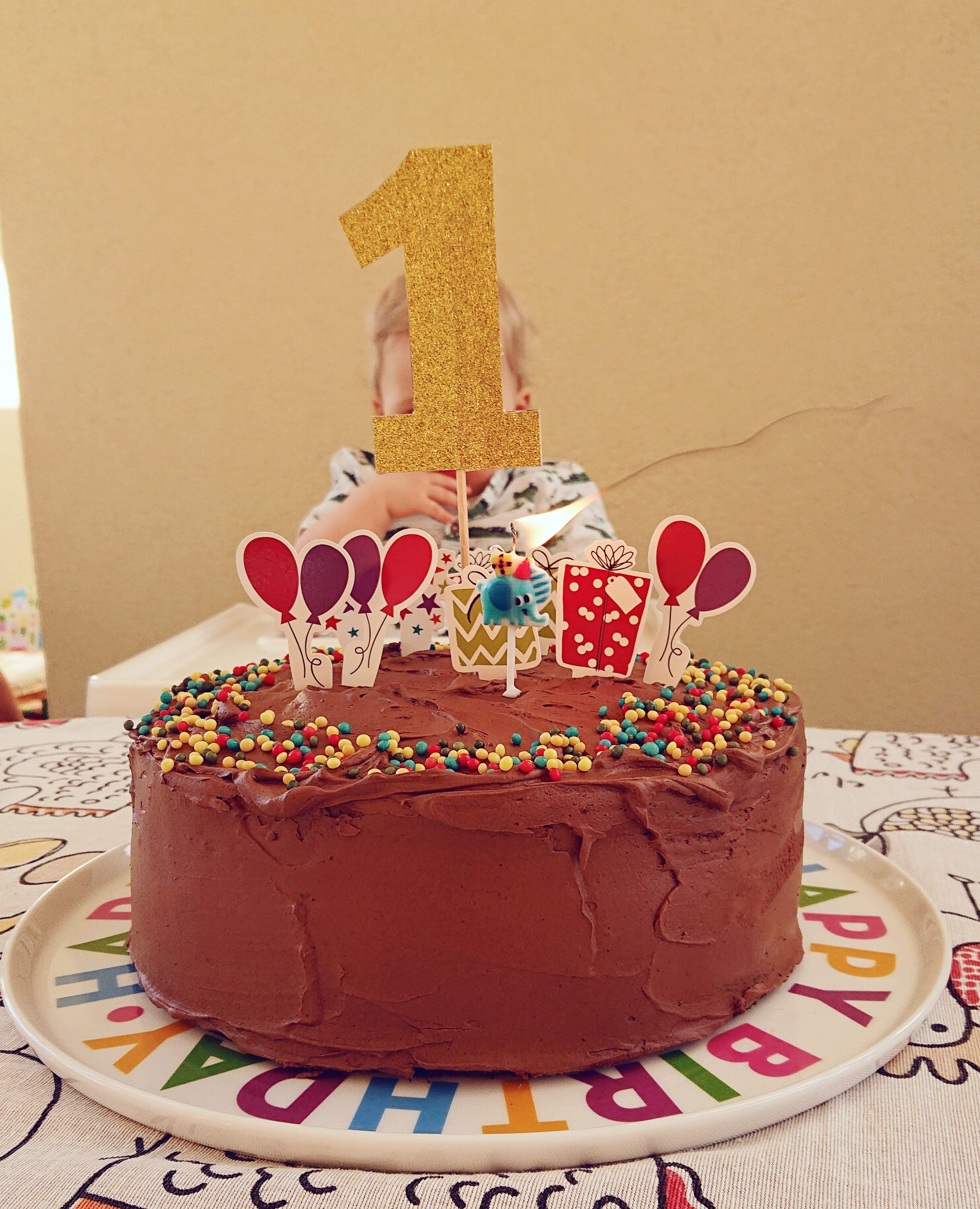 A dekor nálunk nagyon egyszerű lett, körbe a szélére egy kis dekorcukor, egy gyertya és papírdíszek. A nagy 1-est én csináltam, kb 15 perc munkával, a kicsik valami születésnapi témájú cupcake szettből voltak itthon.